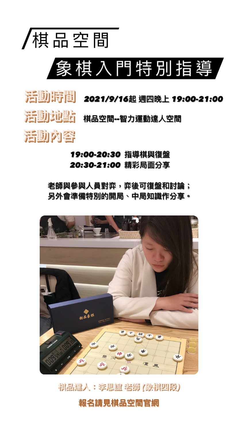 日期:2021/9/16起 每週四 晚上 時間:19:00--21:00 主持人:四段棋手 李思誼Lizzy 19:00-20:30 指導棋與復盤 20:30-21:00 精彩局面分享 活動方式: